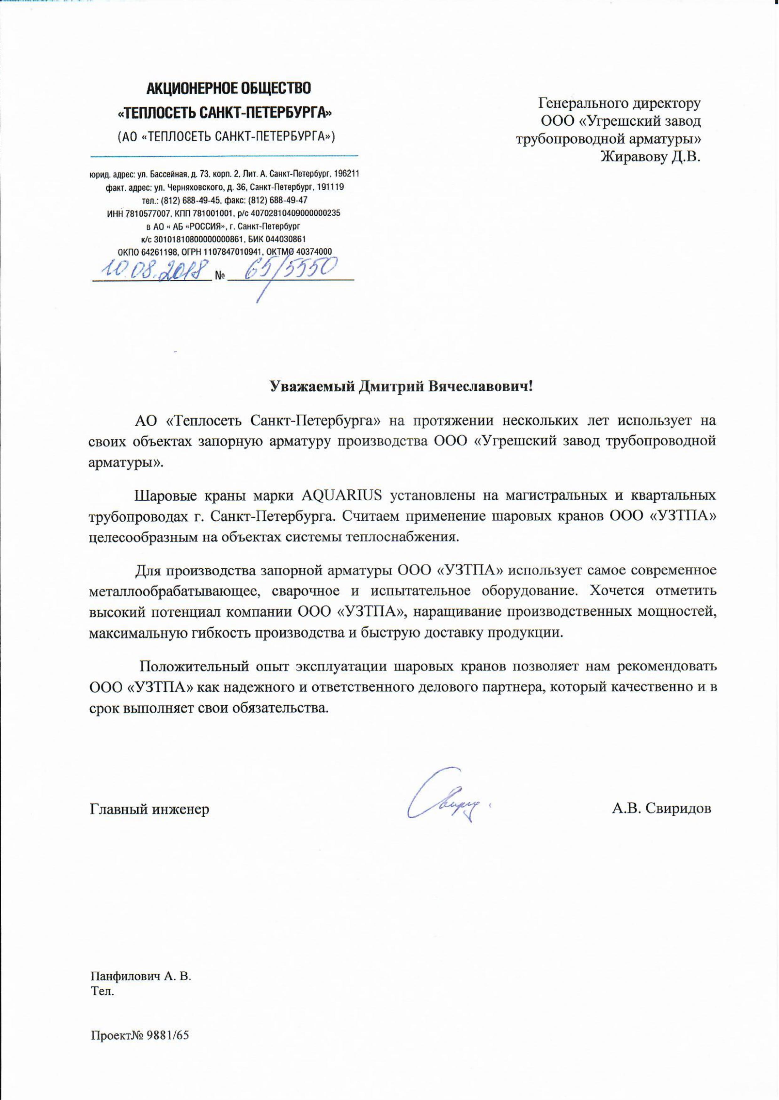 JSC "Teploset of St. Petersburg" has been using stop valves manufactured by UZTPA at its facilities for several years.